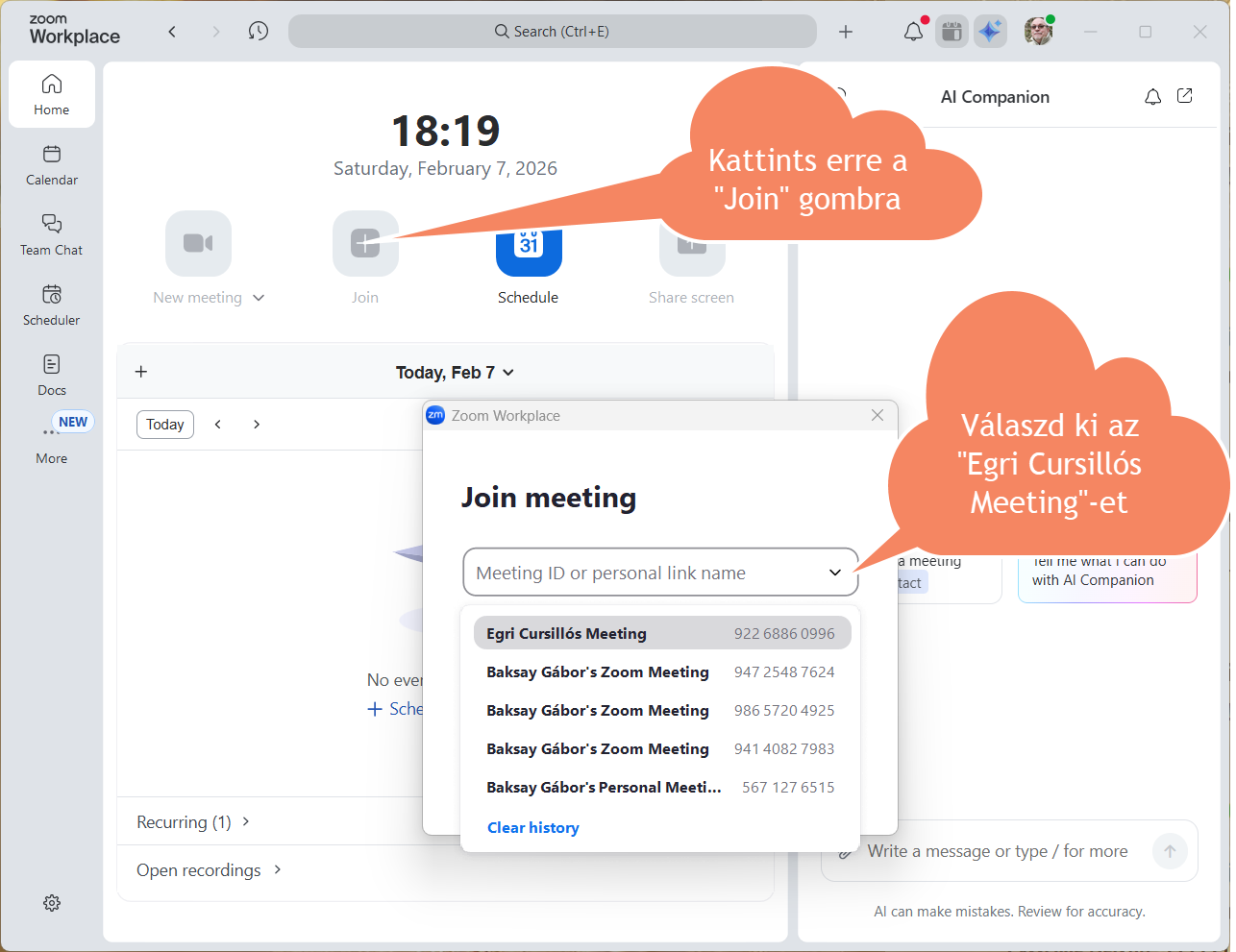 Ha már egyszer csatlakoztál a Lélekmelegítőhöz az új linkkel, akkor az alkalmazás meg fogja jegyezni a találkozó azonosítóját, és ekkor a kék színű „Join” feliratú gombbal is tudsz csatlakozni.